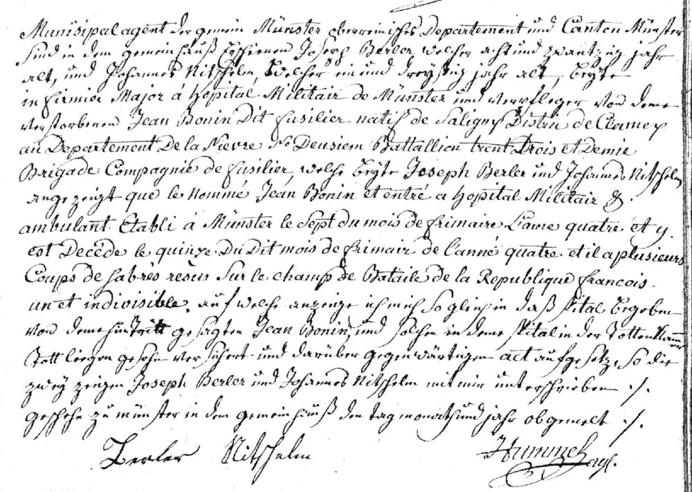 Acte de décès (an IV) du soldat Jean BONIN, originaire de Saligny (district de Clamecy).