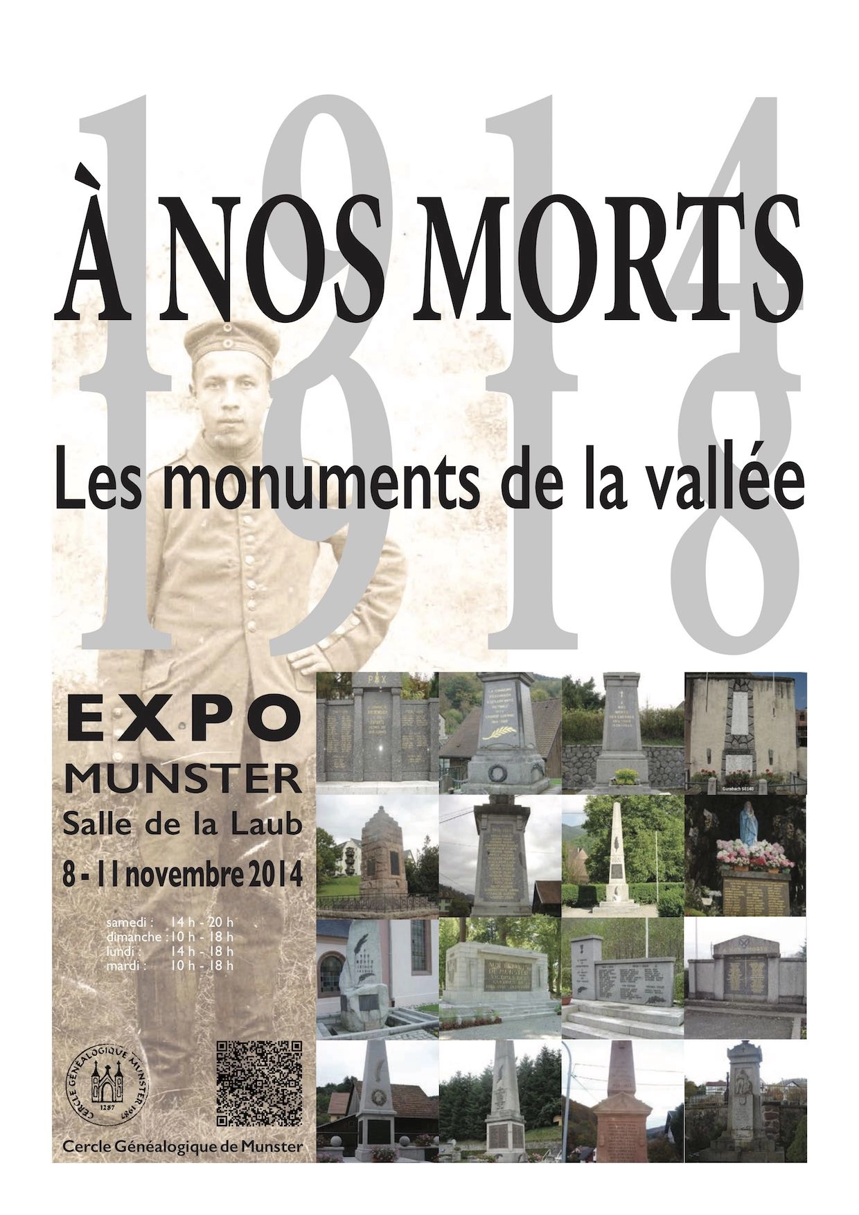 affiche cgm a nos mortsVoilà le fruit de deux années d’incessantes recherches, d’un travail tout à fait considérable. Un travail qui mérite les éloges de tous, effectué par le Cercle généalogique de Munster présidé par Serge Geisert. En effet, comme l’a rappelé le président lors de l’inauguration, samedi soir, « la question qui s’était posée à nous était la suivante : qui sont donc les gens inscrits sur nos monuments aux morts ? ». Une question qui a taraudé nos chercheurs et qui est devenue le fil rouge du Cercle généalogique pour la mise en place de cette exposition réalisée, entre autres, grâce à l’Association du « Menschter tàler » du président Rémy Jaegle « qui nous a apporté son précieux concours avec mise à disposition de nombreux documents… ».